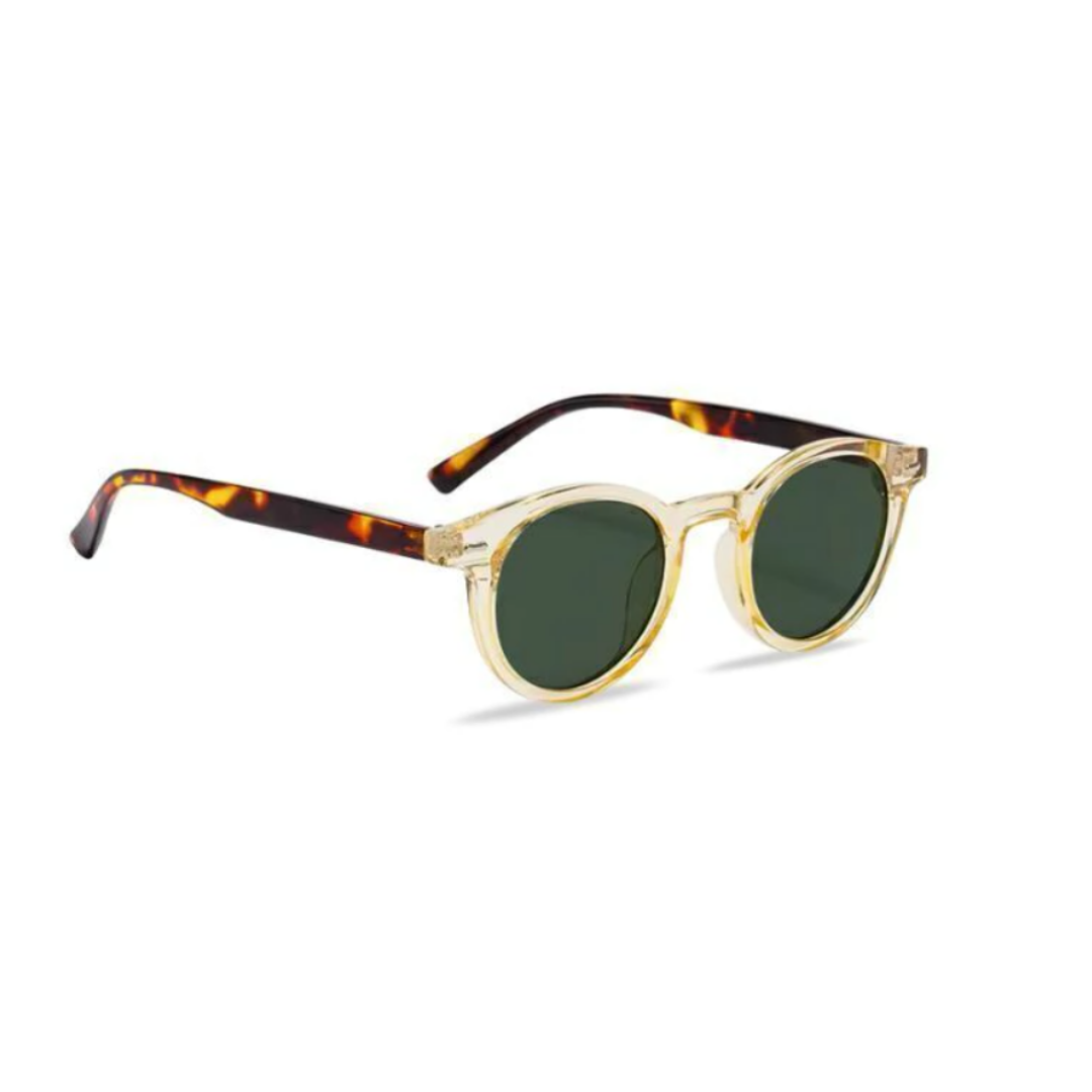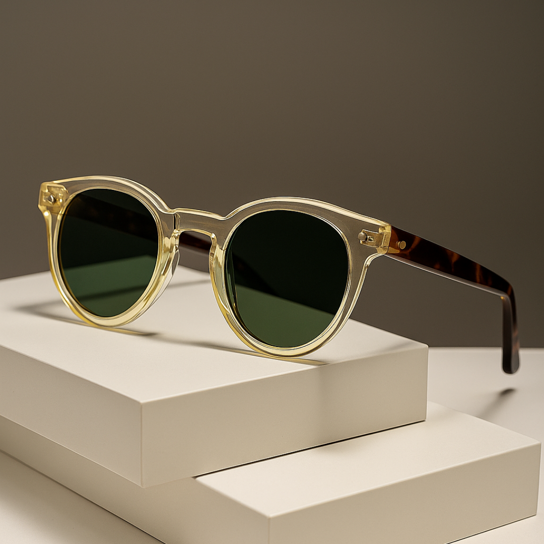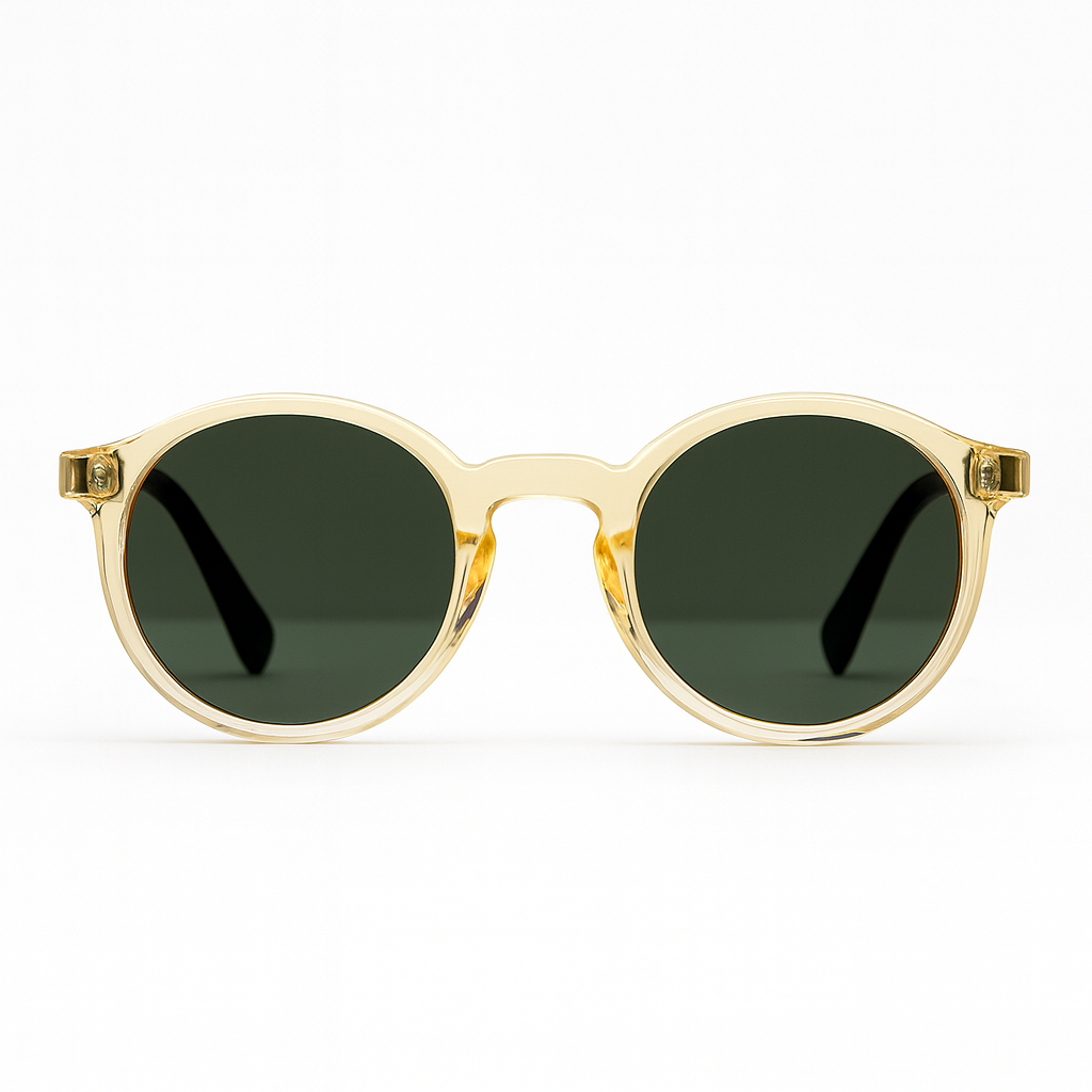 O modelo Venezia combina uma frente translúcida em âmbar claro com hastes em tartaruga clássica, evocando o contraste entre as fachadas luminosas dos palácios venezianos e as sombras dos canais. As lentes verdes escuras oferecem proteção total com um toque retrô-chic, perfeito para quem busca beleza, sofisticação e autenticidade no mesmo olhar.